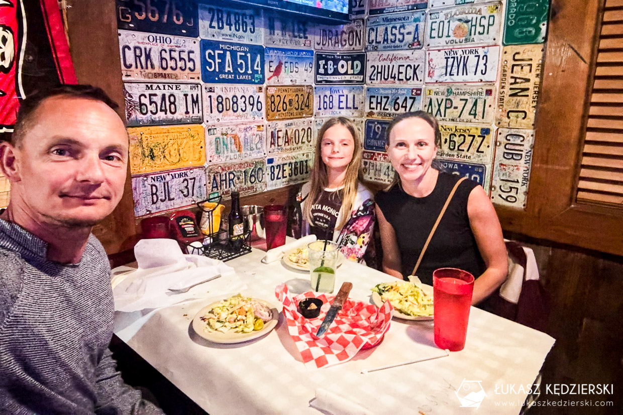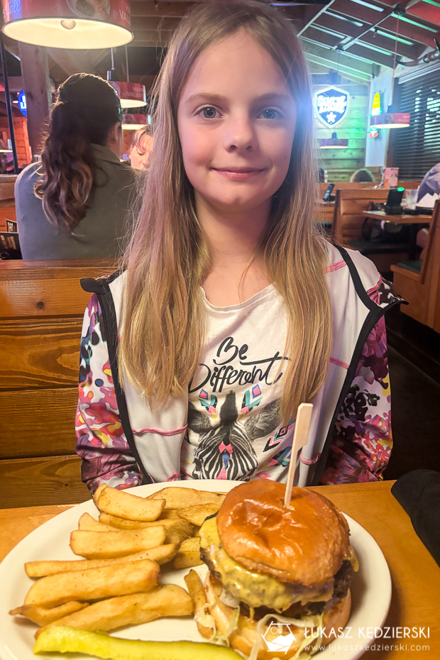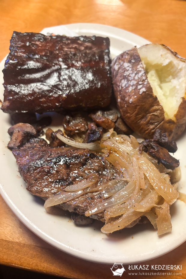 Wiecie, że lubimy jeść prawda? Dzisiaj po drodze nie mieliśmy pomysłu na to, gdzie zjeść kolację więc Aga szybko wyszukała coś na googlu. Nie będę się specjalnie rozpisywał. To był strzał w 10. Texas Roadhouse to chyba bardzo popularna miejscówka, bo na stolik czekaliśmy prawie 30 min. Ależ tu dają dobrze zjeść. Na początek na stole pojawia się koszyk z ciepłymi bułeczkami z dodatkiem masła cynamonowego i woda. Do tego po chwili kelnerka przynosi sałatkę, czyli jedyny zdrowy element naszej dzisiejszej kolacji. Dziewczyny w trakcie wybierania z menu poszły w klasykę. Hamburger i cheeseburger to 250 gr wołowiny Angus, chyba najlepsze, jakie do tej pory jedliśmy w USA, serwowany z pysznymi frytkami. Ja zamówiłem kolejną klasykę tego miejsca. 8 oz stek (230 gram) i połowę sztangi grillowanych żeberek w iście amerykańskim wydaniu, podawane z pieczonym ziemniakiem. Po prostu niebo w gębie. Rewelacja!!!! Musimy tu znów wpaść, bo ledwie wytoczyliśmy się z lokalu. Wszystko było przepyszne!!!