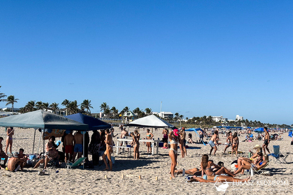 Nie wiem, czy to kwestia weekendu, czy po prostu tutaj na plaży było dużo młodsze towarzystwo niż w West Palm Beach. Dużo młodzieży, studentów i młodych ludzi. Plaża podobna, ale zdecydowanie bardziej wypełniona. Dużo boisk do siatkówki plażowej, dużo budek ratowników. Dookoła dużo grup grających w gry, imprezujących i cieszących się piękną pogodą. Ach będzie nam tych promieni słonecznych brakować.