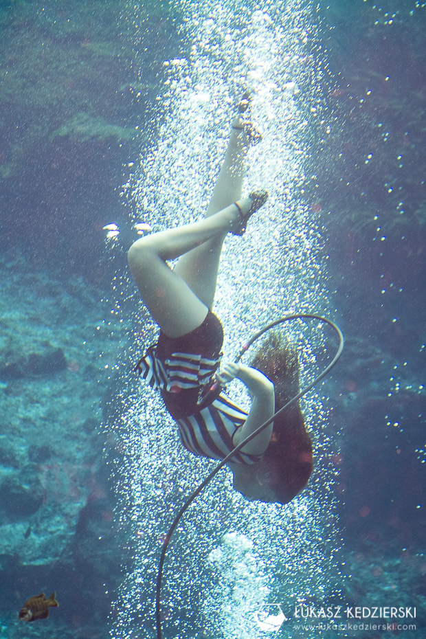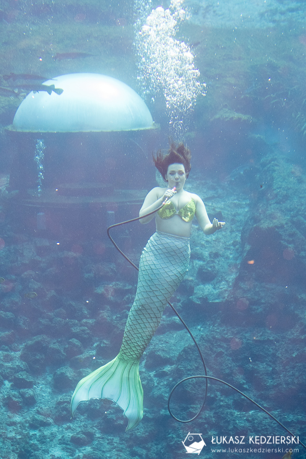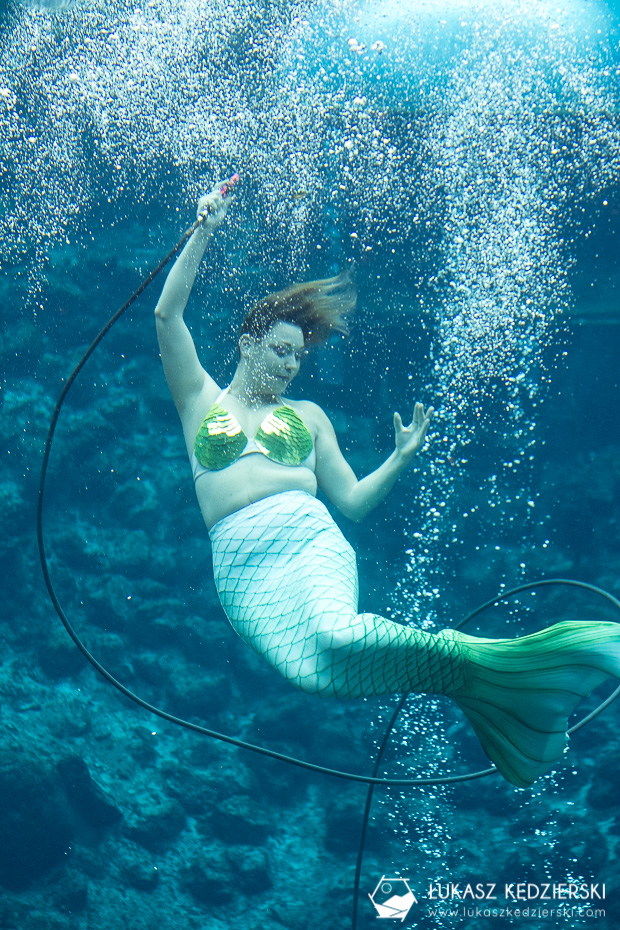 Otóż na Florydzie znajduje się miejsce o nazwie Weeki Watchee Springs State Park, gdzie codziennie można podziwiać „prawdziwe” syreny. To specjalny pokaz, podwodny teatr, który odbywa się od ok. 1947 roku. Piękne panie z kolorowymi syrenimi ogonami robią podwodne show! I to jakie show!!! Nie spodziewaliśmy się, że to przestawienie będzie tak ekscytujące i piękne. Gracja, precyzja, podwodne ewolucje są doskonale przygotowane i widać, że artystki robią to od bardzo dawna. Podobno są różne tematy przedstawień. My mieliśmy przyjemność oglądać opowieść o historii tego miejsca i syren. Wszystko się tu zgadza. Po prostu rewelacja!