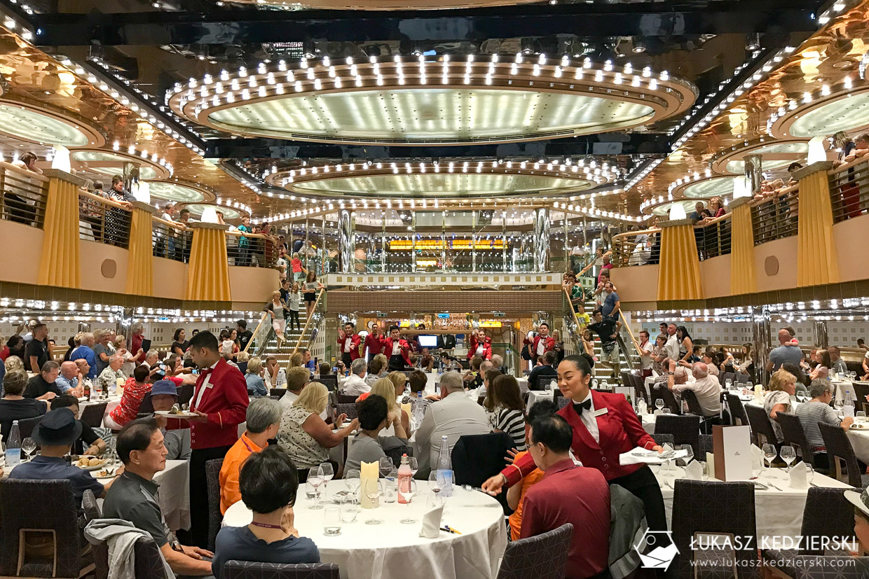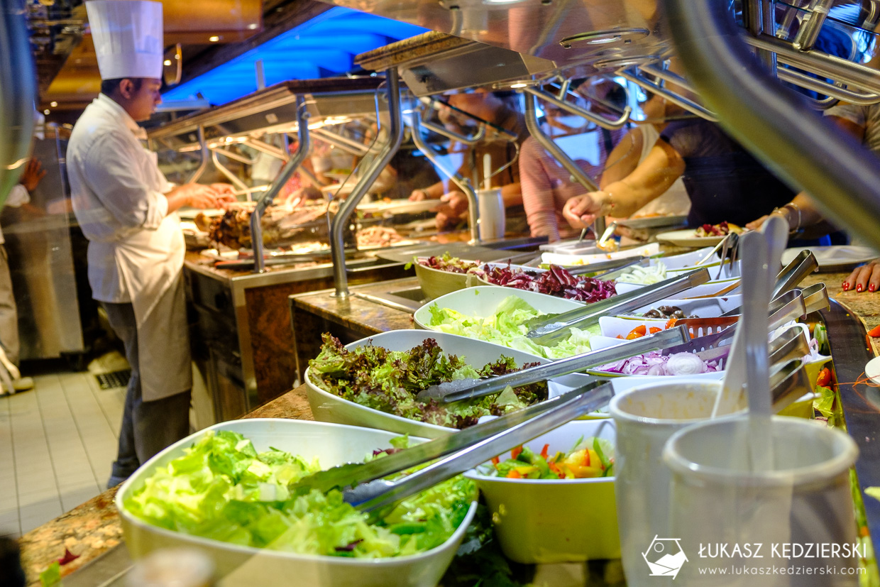 W ramach rejsu statkiem mamy w pakiecie pełne wyżywienie: śniadanie, lunch, przekąski, desery, kolację. Wszystko to jest serwowane w postaci szwedzkiego bufetu o odpowiednich porach. Smakiem przewodnim jest kuchnia włoska, ale nie brakuje wielu innych dań. Jedzenie jest bardzo urozmaicone, a mnogość potraw mocno nas zaskoczyła. Do tego stopnia, że w ciągu tygodniowego rejsu nie byliśmy w stanie spróbować każdego dania. Codziennie większość dań się powtarza, ale też są dodawane/zastępowane nowe związane z miejscem, do którego płynęliśmy. Wszystko było pyszne i świeże i nigdy niczego nie brakowało.