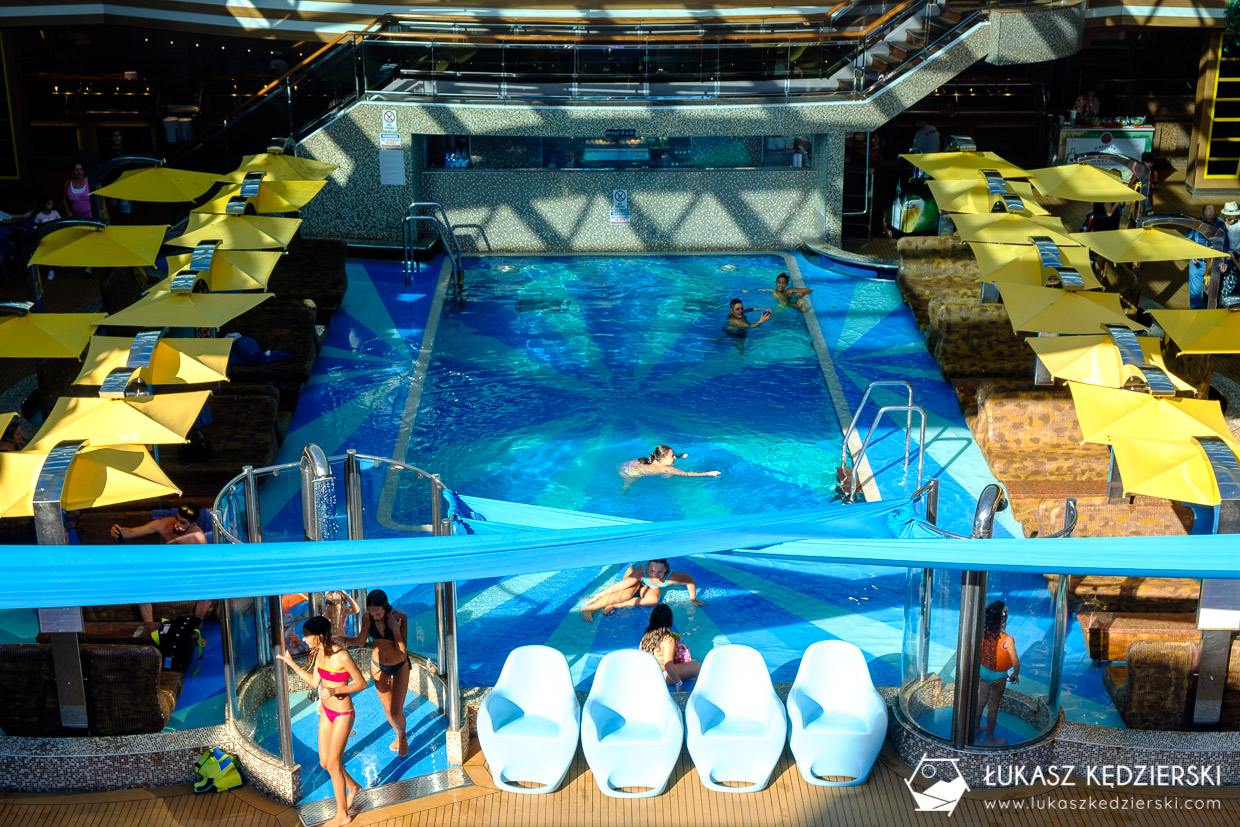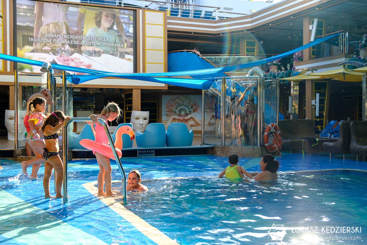 • Basen. Na statku Costa Diadema są 3 baseny. Na górnym pokładzie znajduje się mini basen dla dzieci w stylizacji ze Świnką Peppa. Na X piętrze na rufie znajduje się odkryty basen (głębokość 1,4 metra) z wielkim pokładem słonecznym. Ostatni basen wewnętrzny jest z odkrywanym dachem w zależności od pogody. Na pewno to nie są baseny do sportowego pływania, a jedynie do orzeźwienia się i zabaw w wodzie. W okolicach basenów znajdziemy kamizelki do pływania dla dzieci. Nadii najbardziej podobał się ten ostatni, wewnętrzny basen.