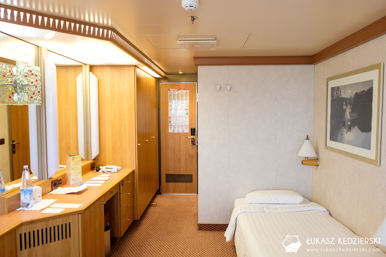 My mieliśmy do dyspozycji kajutę z balkonem. Kabina nie różniła się niczym od dobrze wyposażonego pokoju hotelowego. W środku znajdowało się olbrzymie małżeńskie łoże oraz specjalna dostawka dla Nadii. Na wyposażeniu była lodówka (smakołyki i napoje z lodówki dodatkowo płatne), kilka szaf na ubrania, biurko i sejf oraz kamizelki ratunkowe dla wszystkich gości. Do tego łazienka z prysznicem, umywalką i toaletą. Na wyposażeniu były świeże ręczniki, ręczniki na basen, przybory kosmetyczne, suszarka. Absolutnie niczego nam nie brakowało.