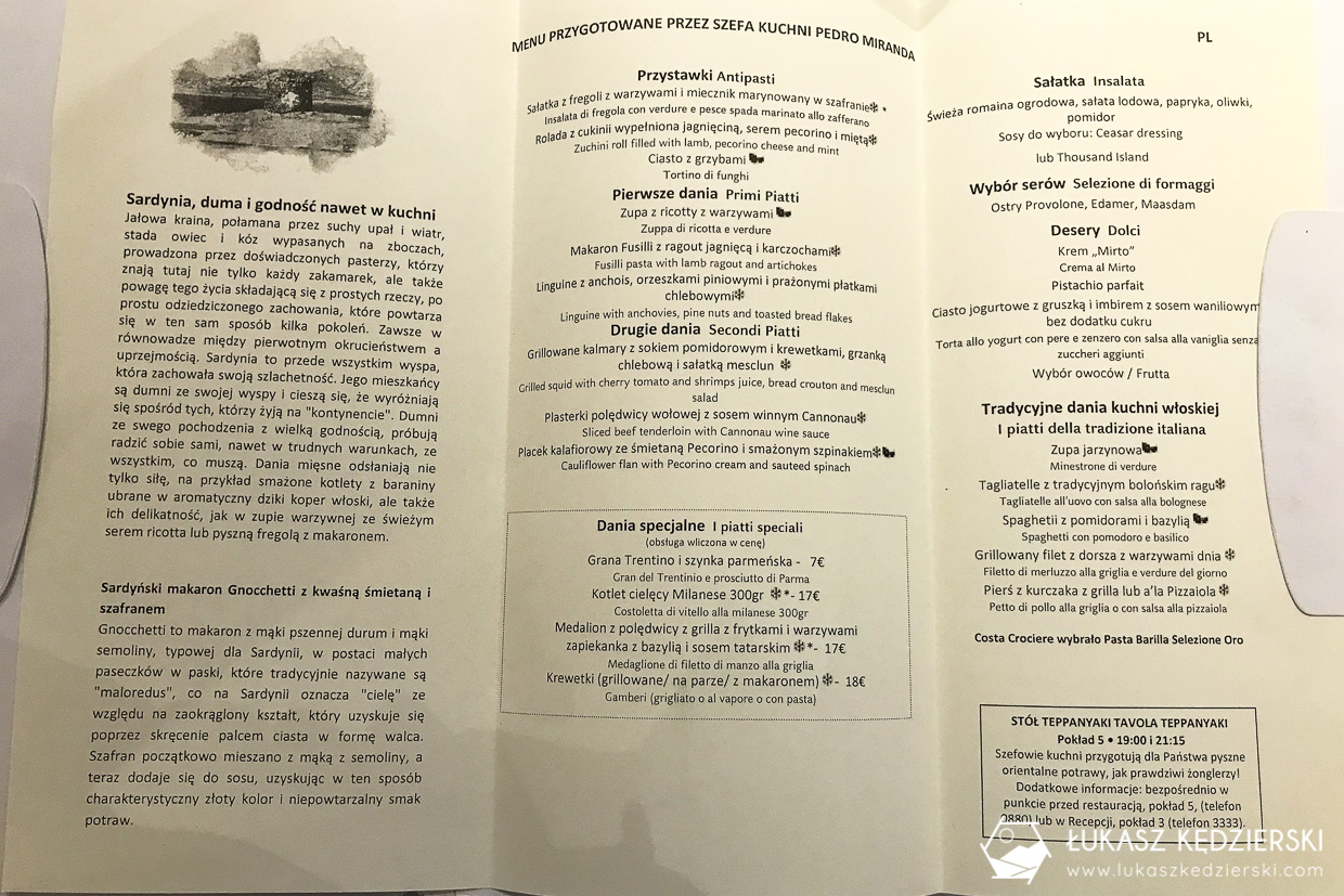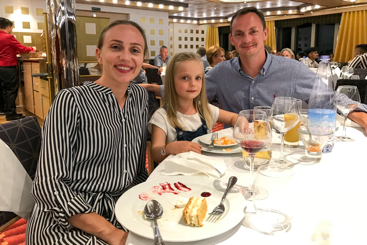 • Kolacja w restauracji Fiorentino (pakiet Premium). Podczas całego rejsu mieliśmy rezerwację stolika na czas kolacji. W restauracji codziennie było inne menu, z którego zamawialiśmy przystawkę, pierwsze i drugie danie oraz deser.